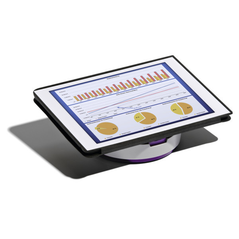 Превосходное решение для презентаций с помощью планшетного компьютера как в вертикальном, так и горизонтальном формате. Вращается на 360 градусов. Оснащена кнопкой, фиксирующей подставку в любом удобном для вас положении. Прорезиненный держатель для планшета обеспечивает надежную фиксацию. Подходит для применения девайса без снятия чехла.